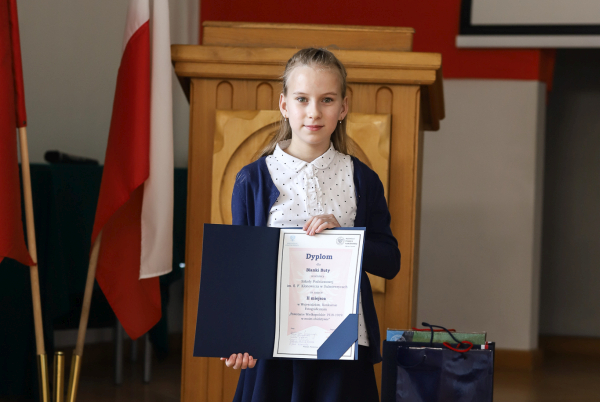 Blanka odebrała gratulacje w towarzystwie pani Dyrektor Beaty Koprowskiej oraz pani Agnieszki Rudnickiej – koordynatora szkolnego etapu konkursu.