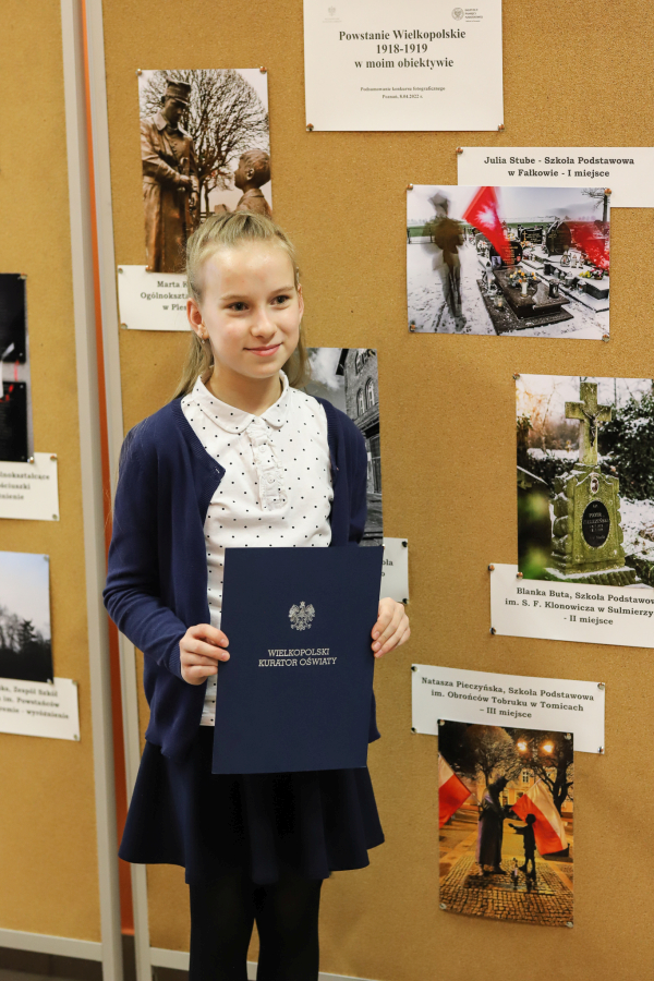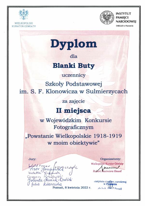 Z wielką dumą i radością informujemy, iż nasza uczennica Blanka Buta zajęła II miejsce w wojewódzkim konkursie fotograficznym ogłoszonym w listopadzie 2021 roku przez Kuratorium Oświaty w Poznaniu oraz poznański oddział Instytutu Pamięci Narodowej pod hasłem: "Powstanie Wielkopolskie 1918/1919 w moim obiektywie”.