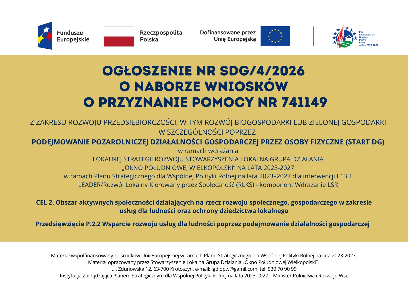 Stowarzyszenie Lokalna Grupa Działania "Okno Południowej Wielkopolski" uprzejmie informuje o ogłoszeniu naboru wniosków o przyznanie pomocy nr 741149 w ramach PS WPR na lata 2023-2027 dla interwencji I.13.1 - LEADER/Rozwój Lokalny Kierowany przez Społeczność (RLKS) – komponent Wdrażanie LSR z zakresu rozwoju przedsiębiorczości, w tym rozwój biogospodarki lub zielonej gospodarki w szczególności poprzez podejmowanie pozarolniczej działalności gospodarczej przez osoby fizyczne (Start DG).