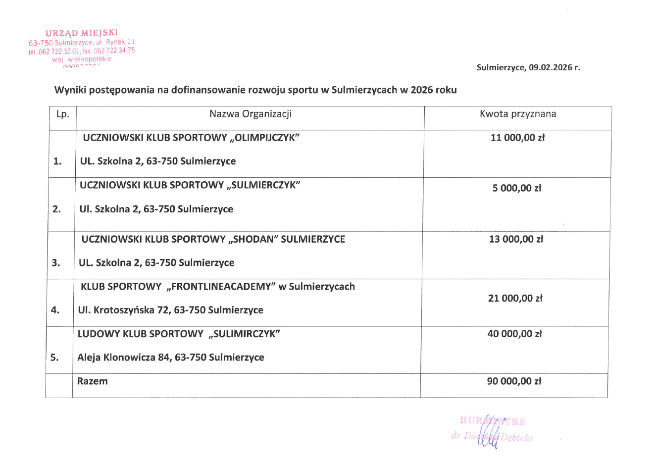Wyniki postępowania na dofinansowanie rozwoju sportu w Sulmierzycach w 2026 roku
